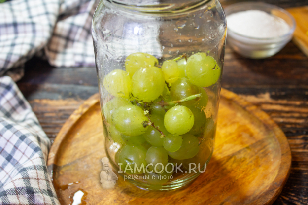 Подготовьте банки: простерилизуйте их удобным для вас способом, крышки также прокипятите в воде на плите. В чистую банку выложите веточки винограда. Можете, по желанию, отделить ягодки.
