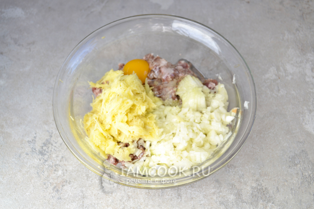Разбейте яйцо, добавьте мелко нарезанный репчатый лук и натертую на мелкой терке очищенную картошку. Вместо картошки можно использовать белый хлеб, предварительно замоченный в молоке, натертый кабачок.