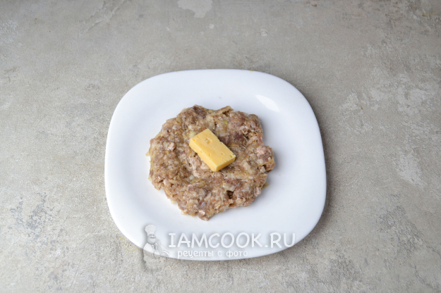 Возьмите порцию фарша, расплющите его в лепешку толщиной примерно 0,5-0,7 см, в центр положите брусочек сыра.