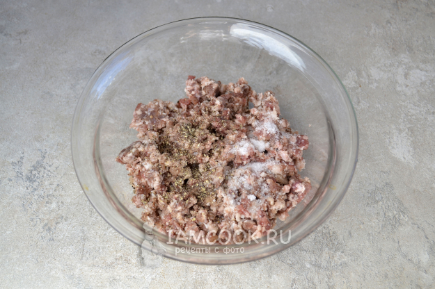 Фарш положите в глубокую миску. Посолите и посыпьте черным молотым перцем.