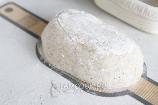 Через указанное время сформировать хлебную заготовку. Стол подпылить мукой, перевернуть чашу с тестом на рабочую поверхность. Тесто слегка растянуть и собрать в виде треугольника, как ЗДЕСЬ. Далее собрать края к центру, сформировать заготовку в виде бочонка, закрепить края по центру и переложить заготовку в расстоечную корзину швом вверх.