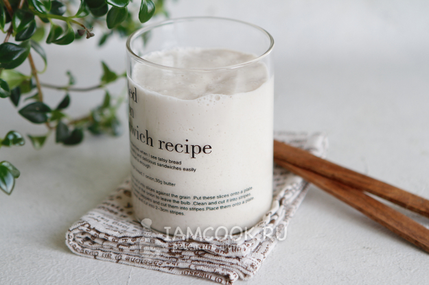 Закваску я выводила чуть меньше, чем полгода назад. Пеку на ней раз в неделю, кормлю не каждый день, поэтому храню ее в холодильнике. За день до выпечки я достала закваску из холодильника и дважды ее покормила, один раз - вечером, а второй раз - утром, по следующей смехе: 50 г закваски, 50 г муки и 50 г воды.