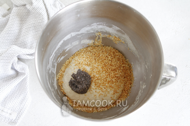 Я замешивала тесто в планетарном миксере. Тесто совсем неприхотливое, можно замесить и вручную. Заранее слегка поджарить семена кунжута и замочить семена чиа.