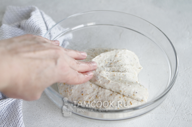 Если будете замешивать тесто вручную, то его лучше всего выложить на стол, смазанный маслом. На протяжении всего замеса сворачивайте тесто внутрь, пока не добьетесь гладкости. В процессе замеса тесто будет непослушным, может рваться, прилипать к рукам. Это нормально, ничего добавлять не нужно. Для удобства руки можно смазать маслом. Как только тесто будет собираться в шар, добавляйте семена чиа и кунжута и продолжайте замес еще несколько минут.