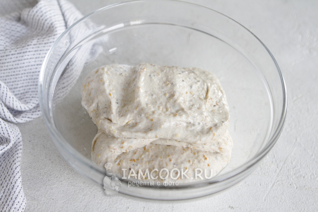 Складываем тесто самым простым способом, в виде конверта. Аккуратно поднимаем край теста и направляем его к середине. Повторяем аналогичную процедуру с каждой стороны. Аккуратно переворачиваем тесто, обнимаем его, формируем шар и оставляем до следующего складывания на столе при комнатной температуре.