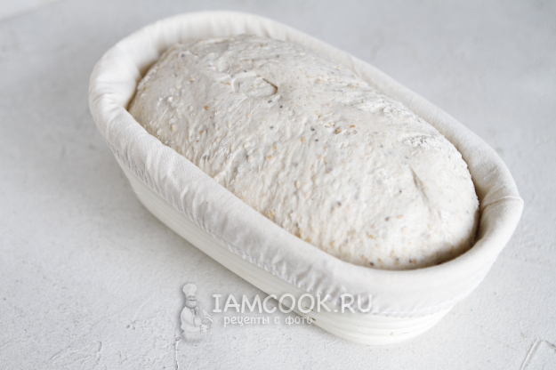 Корзину с тестом затянуть пищевой пленкой и отправить в холодильник на расстойку на ночь.