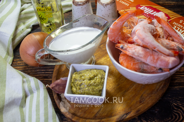 Соберите необходимые продукты для приготовления пасты с креветками в сливочным соусом с песто. Я использовала цельнозерновые спагетти и варено-мороженые креветки. Креветки я только разморозила, почистила и добавила к соусу. Если у вас сырые, то отварите их с минутку, а затем очистите.