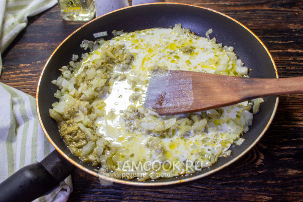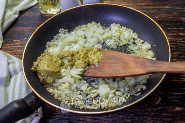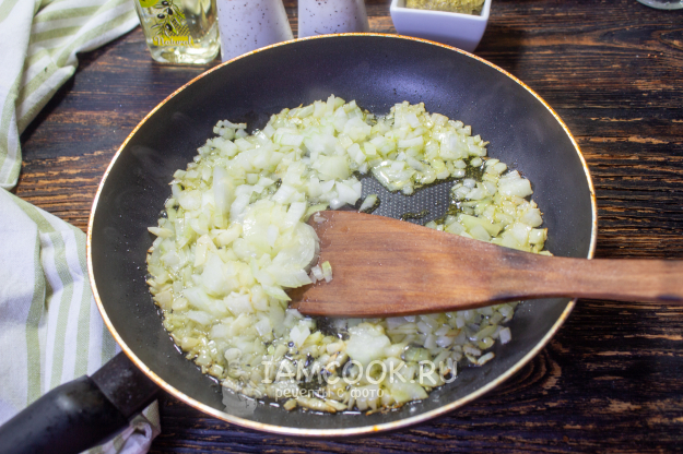 На оливковом масле обжарьте до мягкости очень мелко нарезанный лук и чеснок.