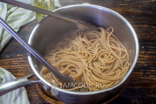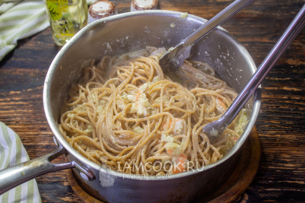 Затем соус смешайте с приготовленными спагетти и держите на плите с минутку.