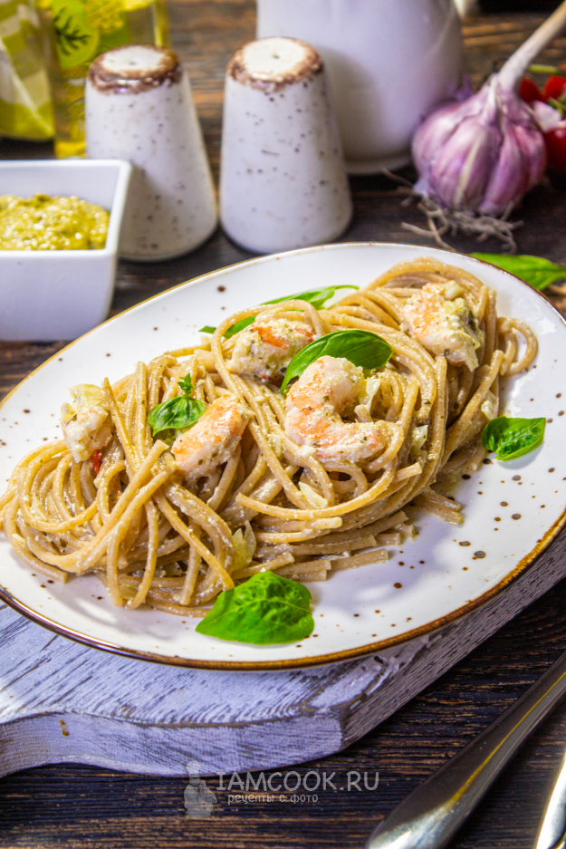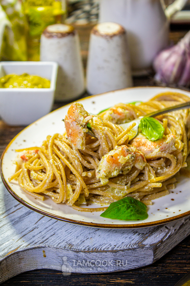 Паста с креветками в сливочным соусом с песто готова! Подавайте сразу на стол!
