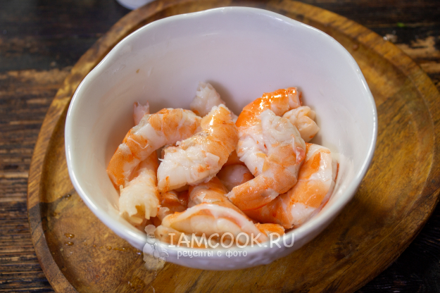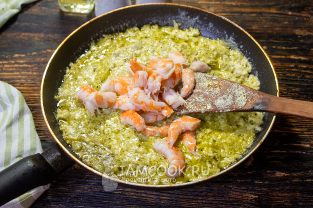 В соус добавьте креветки. Для удобства я их нарезала на более мелкие кусочки. Готовьте соус с креветками 2-3 минуты.
