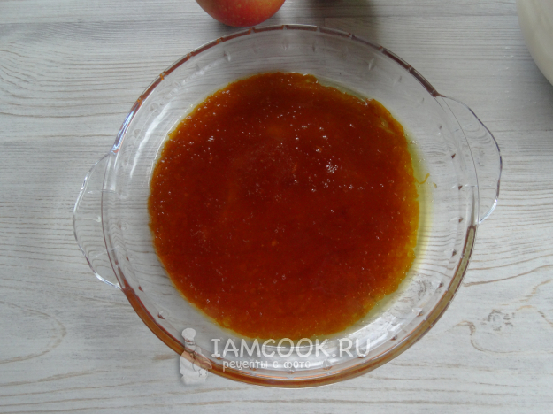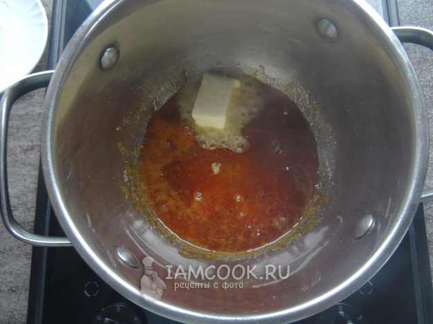 Когда масло растает, перелить карамель в форму, в которой будете выпекать пирог.