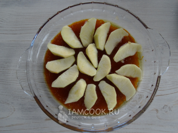 Разложить поверх карамели дольки яблок, можно сделать толстые дольки.