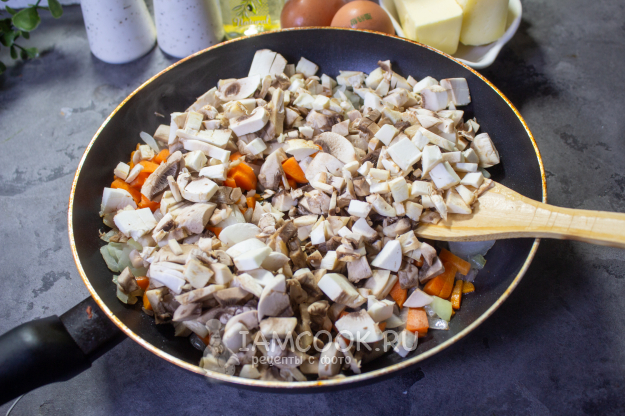 Добавьте нарезанные небольшими кусочками грибы и готовьте вместе, пока грибы не уменьшатся в объеме и не станут мягкими.
