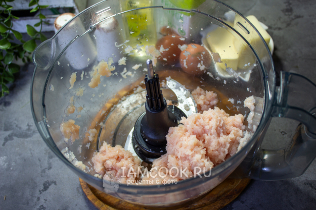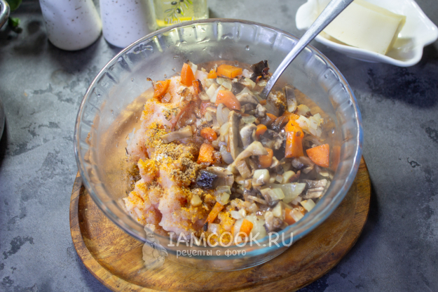 Приготовленную зажарку из овощей и грибов посолите, поперчите и разделите визуально на две равные части. Одну часть овощей добавьте к куриному фаршу, добавьте любимые специи и тщательно перемешайте.