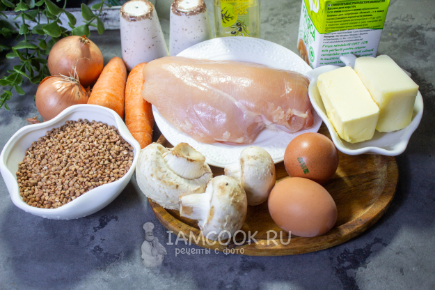 Соберите все необходимые продукты для приготовления куриной запеканки с гречкой и грибами. Можно использовать гречневую кашу, оставшуюся после обеда или ужина, и готовый куриный фарш. Тогда блюдо приготовится быстрее.