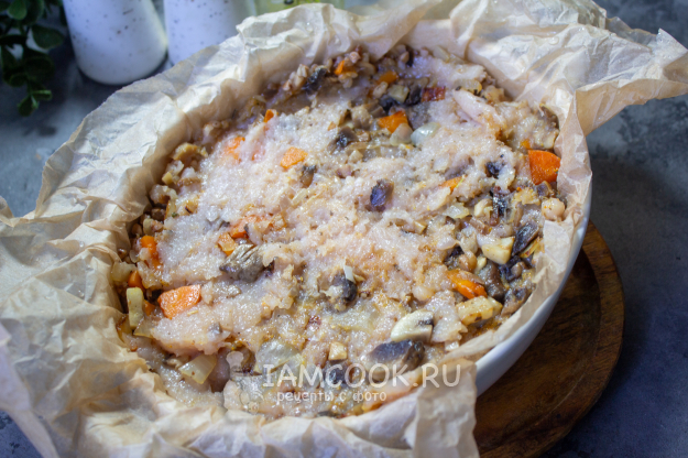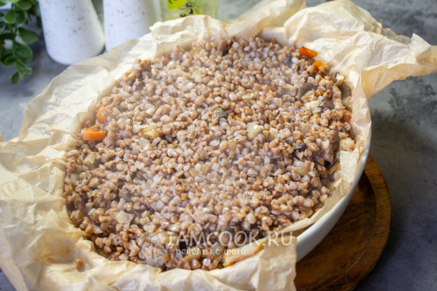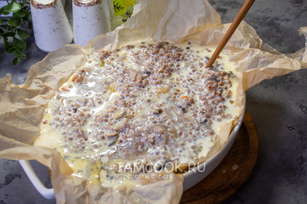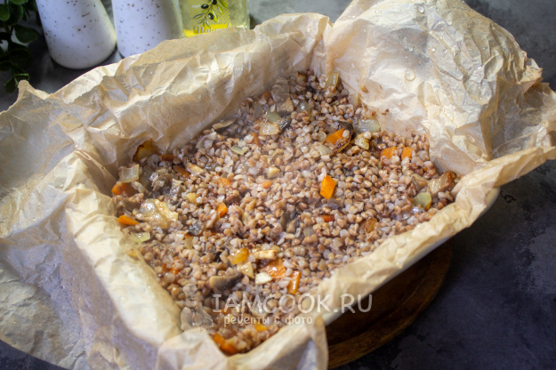 Соберите запеканку: форму размером 15 на 20 сантиметров выстелите пергаментом (не обязательно), выложите половину приготовленной гречневой каши с овощами, разровняйте поверхность, слегка уплотнив слой ложкой.