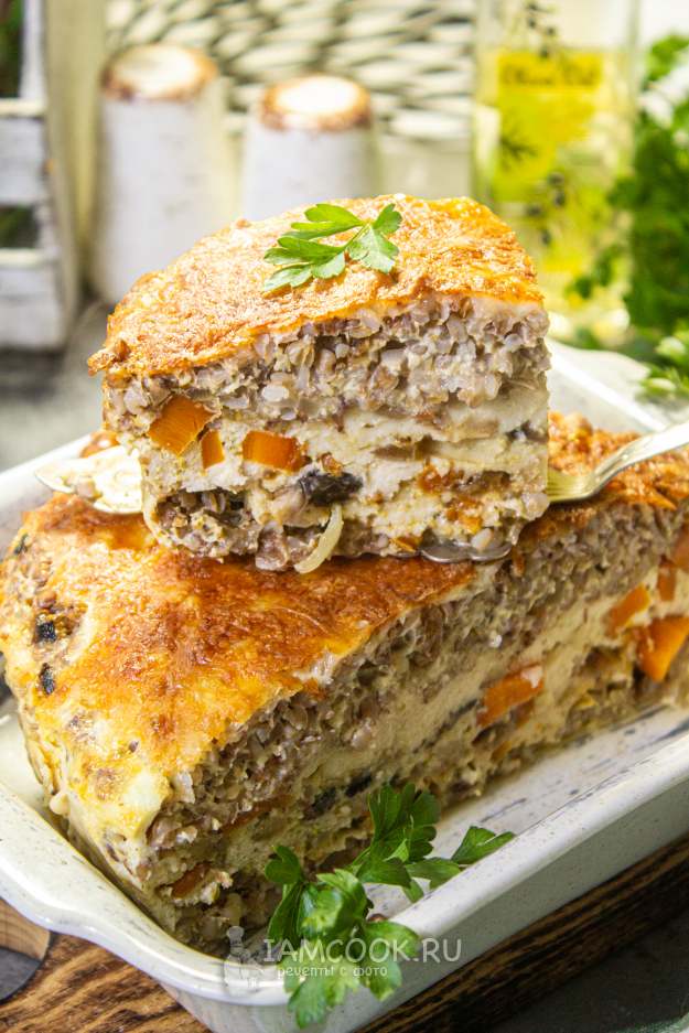 Куриная запеканка с гречкой и грибами готова! Дайте ей остыть минут 10 и можно подавать!