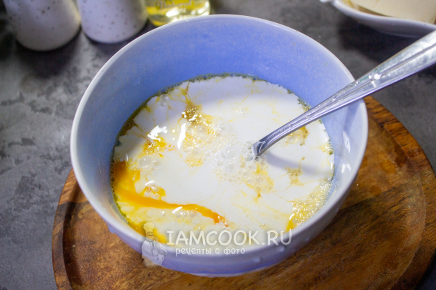 Приготовьте заливку: смешайте куриные яйца, соль, перец и сливки.