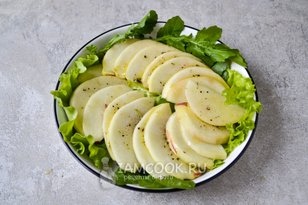 Разложите нарезанный персик на рукколу.