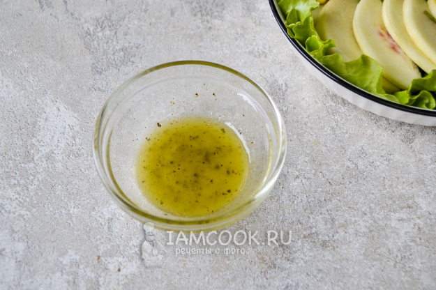 Для заправки соедините в мисочке оливковое масло, выжатый лимонный сок, посыпьте черным молотым перцем, солью.