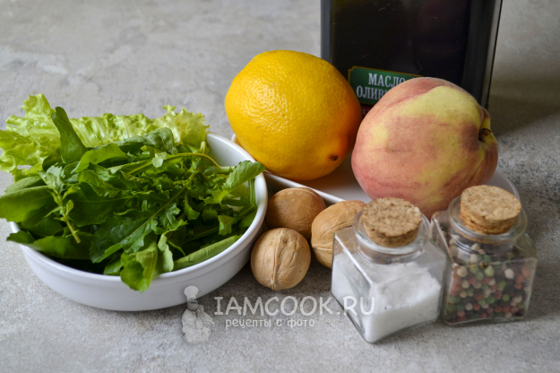 Соберите все необходимые продукты для приготовления салата с рукколой и персиками. Персик вымойте и обсушите. Рукколу вымойте и отряхните от воды. По желанию возьмите листовой салат или микс салатных листьев.