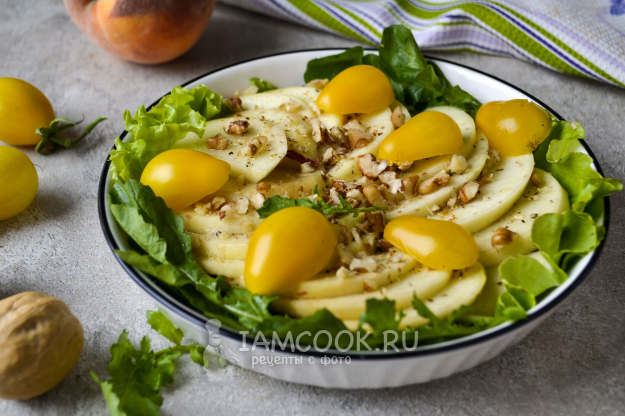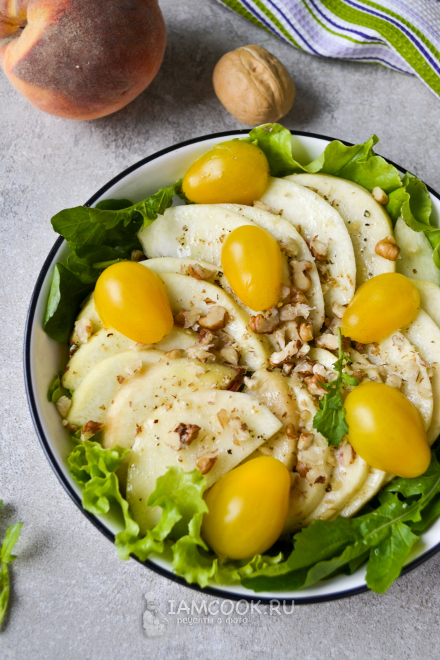 Посыпьте салат дроблеными грецкими орехами. Вот и всё - салат с персиком и рукколой готов к подаче.