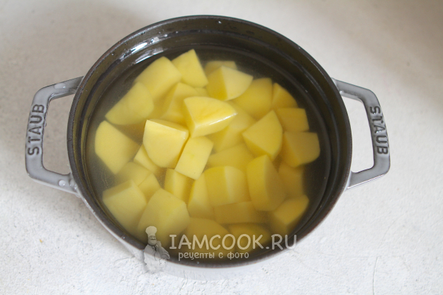 Картофель почистить. Чтобы ускорить процесс приготовления картофеля, я нарезала его на небольшие кубики. Отправляем картофель в прохладную воду и ставим на плиту. Как только закипит вода, слегка убавить огонь и посолить. Варить картофель до готовности, примерно 20 минут. Как только картофель будет готов, слить воду и дать ему немного остыть.
