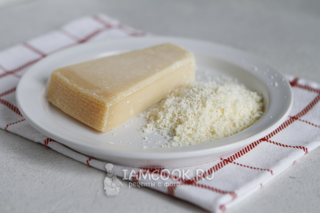 Любой твердый сыр натереть на мелкой терке. В этом рецепте я использовала сыр Пармезан.