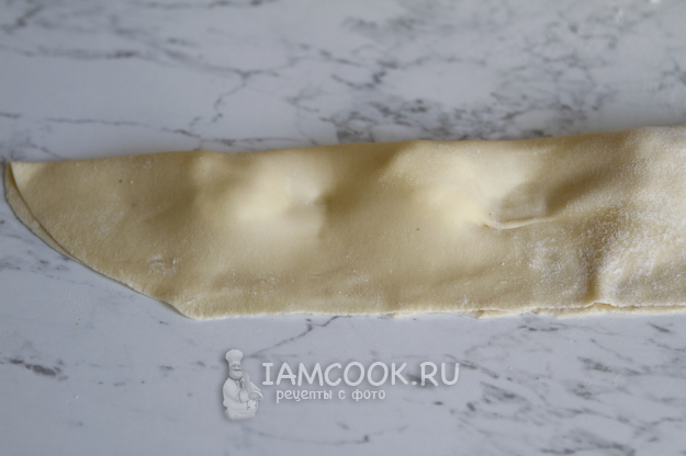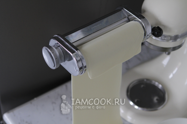 Отдохнувшее тесто раскатать удобным для вас способом. Я раскатывала тесто в пласт при помощи специальной насадки для миксера.