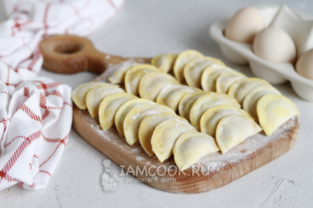 Можно раскатать круг диаметром примерно 40-50 см, толщиной не больше 3 мм. Кондитерским кольцом вырезать кружочки нужного вам диаметра. На каждый из них выложить картофельную начинку и закрепить края вареников.