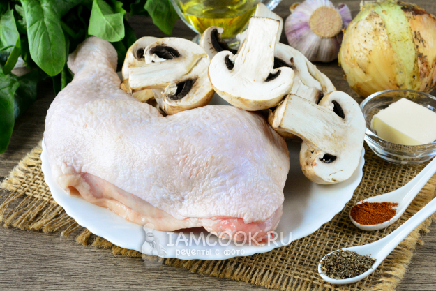 Соберите необходимые продукты для приготовления курицы с грибами в рукаве в духовке.