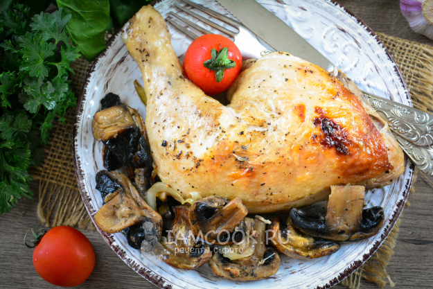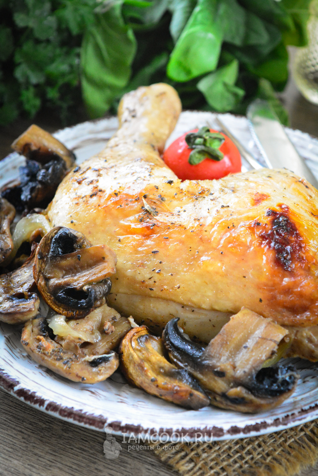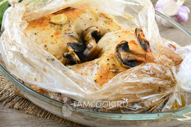Запекайте курицу с грибами в рукаве в духовке примерно 40 минут при температуре 180-190°С. Пусть курица подрумянится.