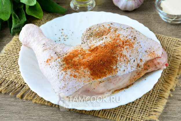 Для рецепта используйте любые части курицы - здесь отлично подходят куриные окорочка. Мясо курицы сполосните, натрите солью, черным перцем, добавьте паприку и сушеный базилик для аромата.
