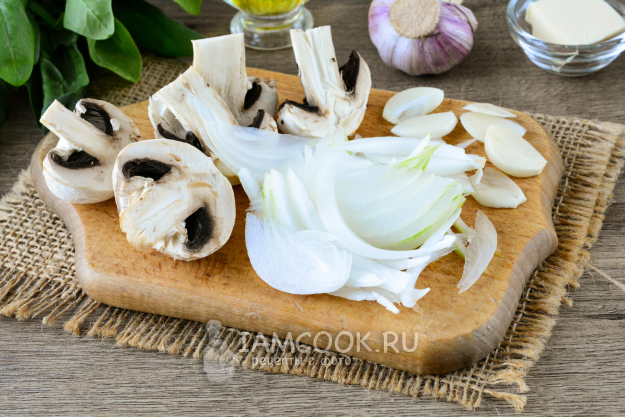 Почистите репчатый лук, чеснок и грибы. Лук нарежьте полукольцами, грибы - половинками, чеснок - пластинками. Грибы не режьте мелко, они еще уменьшатся в процессе запекания.