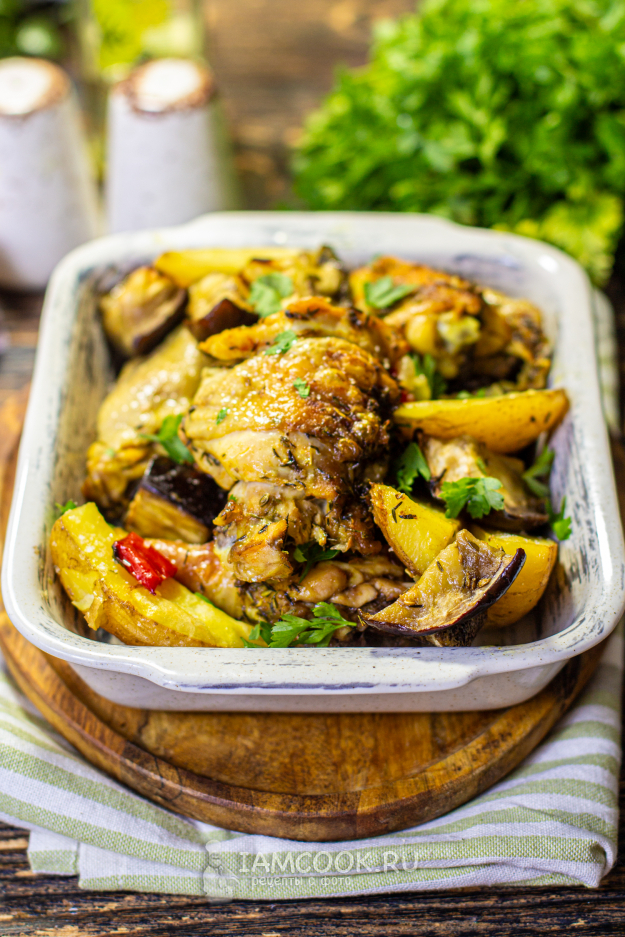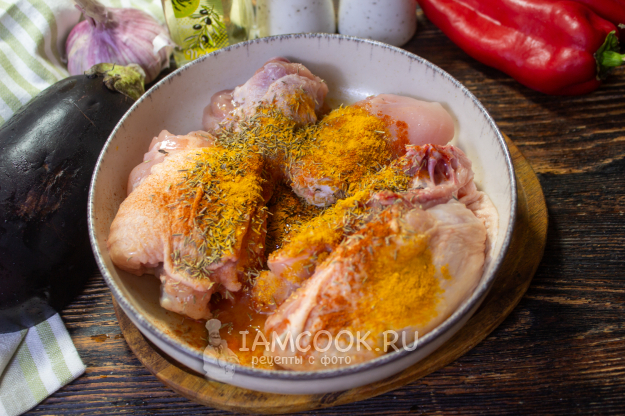 Соберите необходимые продукты для приготовления курицы с картошкой и баклажанами в духовке. Курицу можно замариновать накануне, если располагаете временем, так она получится еще более сочной и ароматной.