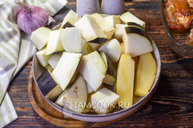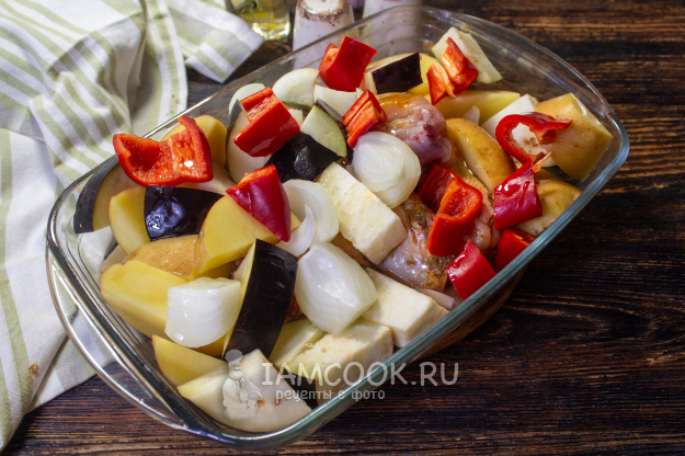 Картофель и баклажаны помойте, обсушите и нарежьте крупными дольками. Лук и красный сладкий перец - крупными кусками. Овощи посолите и поперчите.