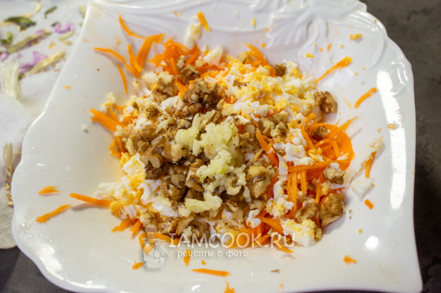 Грецкие орехи подсушите на сухой сковороде в течение пары минут, а затем порубите на небольшие кусочки. Отправьте орехи в салатник. Чеснок пропустите через пресс и тоже добавьте к остальным ингредиентам.