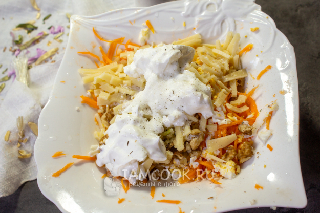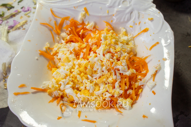 Добавьте к тыкве натертые на мелкой терке отварные яйца.