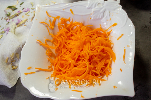 Натрите на терке для моркови по-корейски или обычной, с крупными ячейками.