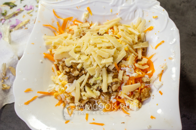 Сыр натрите на терке и добавьте в салатник. Я нарезала его мелко, так как был нарезной.