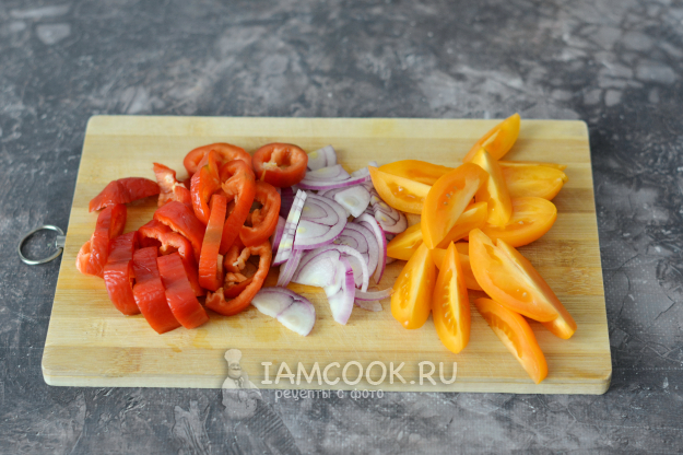 А тем временем нарежьте помидоры, лук и перец на свое усмотрение. Я нарезала помидоры дольками, лук - полукольцами, а перец - соломкой.
