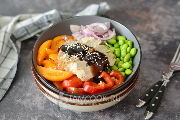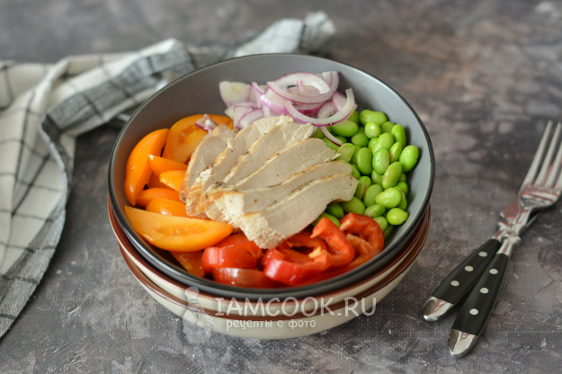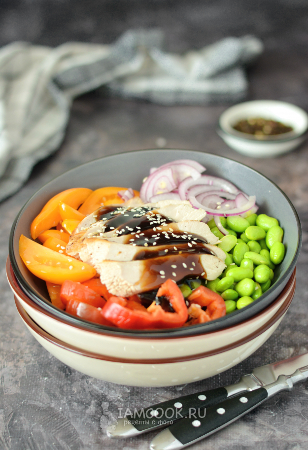Овощную составляющую вы можете менять по сезону и наличию овощей. К примеру, бобы эдамаме можно заменить отварной брокколи или стручковой фасолью, а помидоры и перец поменять на огурец и морковь. В приготовлении боула нет конкретного списка ингредиентов. Есть только принцип конструктора: все ингредиенты раскладываются, не смешиваясь друг с другом.