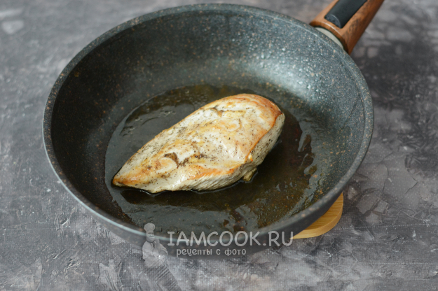 На сильном огне разогрейте сковороду с небольшим количеством масла. Обжарьте куриное филе по 5 минут с каждой стороны на сильном огне. Затем влейте в сковороду пару-тройку столовых ложек воды, накройте крышкой и убавьте огонь. Доготовьте куриное филе еще примерно 15 минут, затем снимите с огня.