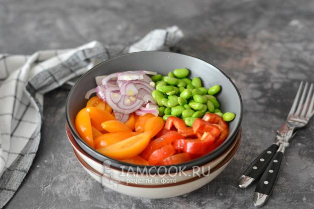 Разложите все овощи и эдамаме отдельными кучками, не смешивая их между собой. Можете посолить и поперчить по вкусу, а также сбрызнуть оливковым маслом.
