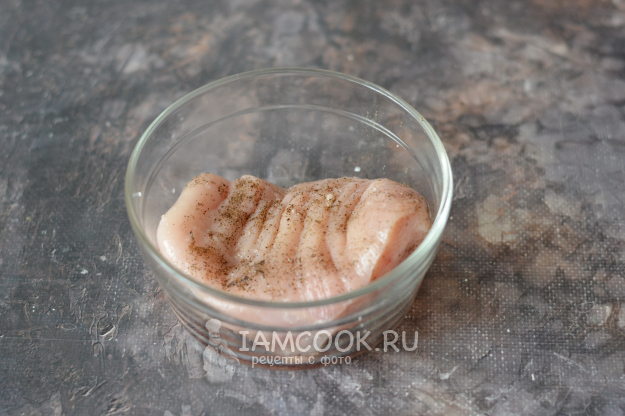 Для начала нужно приготовить куриное филе. Посолите и поперчите его с двух сторон по вкусу. Можете сбрызнуть соком лимона, если нравится.