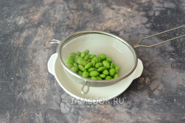 Отварите бобы эдамаме и откиньте их на сито. О том, как сварить эдамаме, смотрите в этом рецепте.