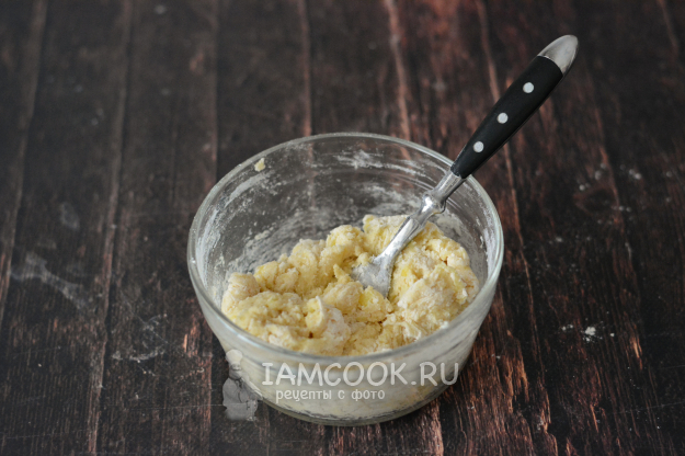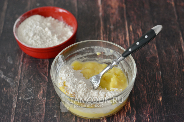 Всыпьте муку и вмешайте её в тесто вилкой.