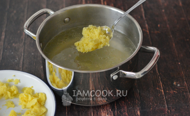 Доведите до кипения бульон с кусочками куриного мяса и положите в него оставшийся размятый картофель.