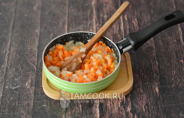 Пока варится курица с картошкой, приготовьте заправку для супа. Нарежьте мелко лук и морковь и слегка поджарьте их на разогретом масле до легкого румянца.